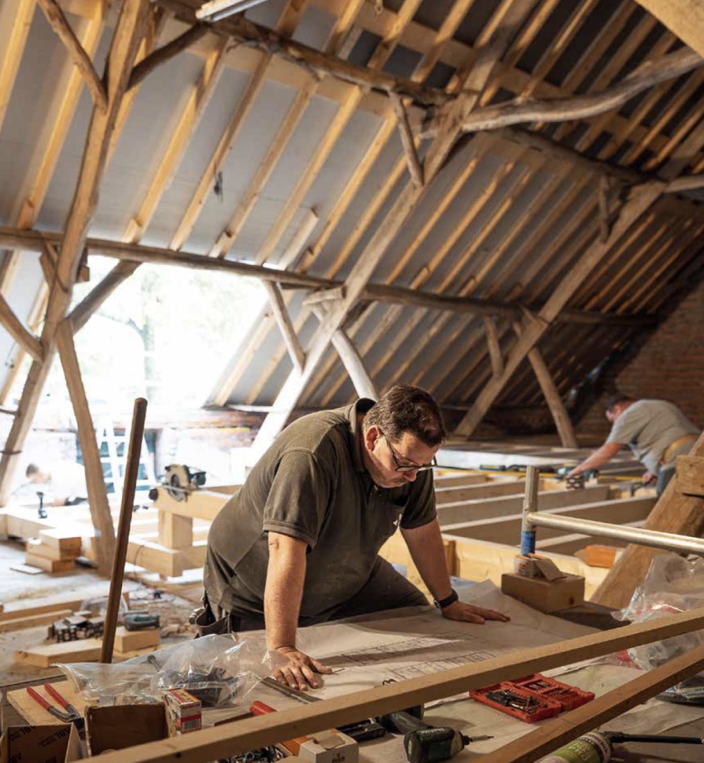 Het verbouwen van de monumentale boerderij uit 1916 die dienst gaat doen als zorgboerderij is een kolfje naar onze hand. Inmiddels hebben we het uitvlakken en verstevigen van de oude sporenkap én het aanbrengen van nieuw dakbeschot afgerond.